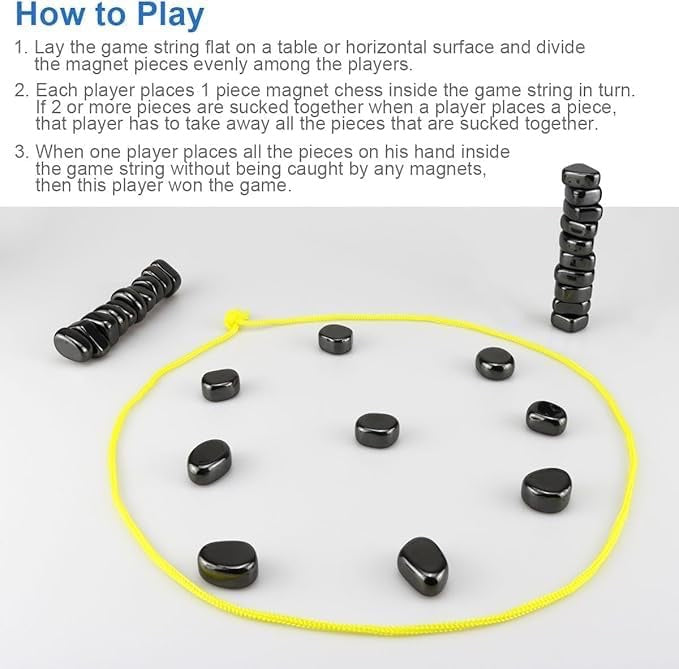 - 【Easy to Understand Rules】This chess set Place all your magnetic chess in the rope and do not attract any magnetic chess. If other magnet flags are attracted, pick up the attracted magnetic chess. Players take turns repeating this rule until all the magnetic chess in someone's hand are successfully put down. The first one to achieve this goal wins!